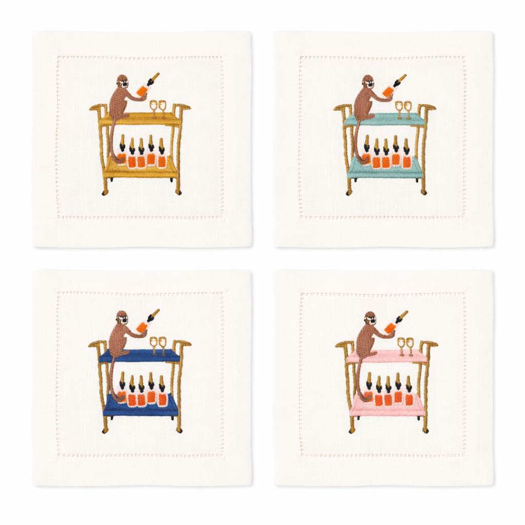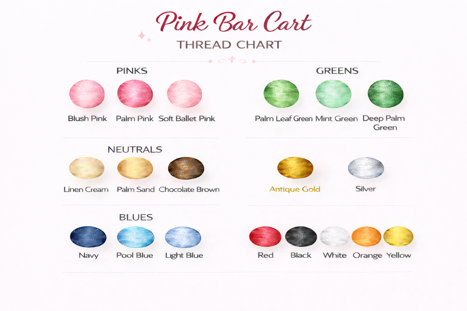 Refer to color chart for Bar Cart thread color options (shown in antique gold, mint green, navy and palm pink)