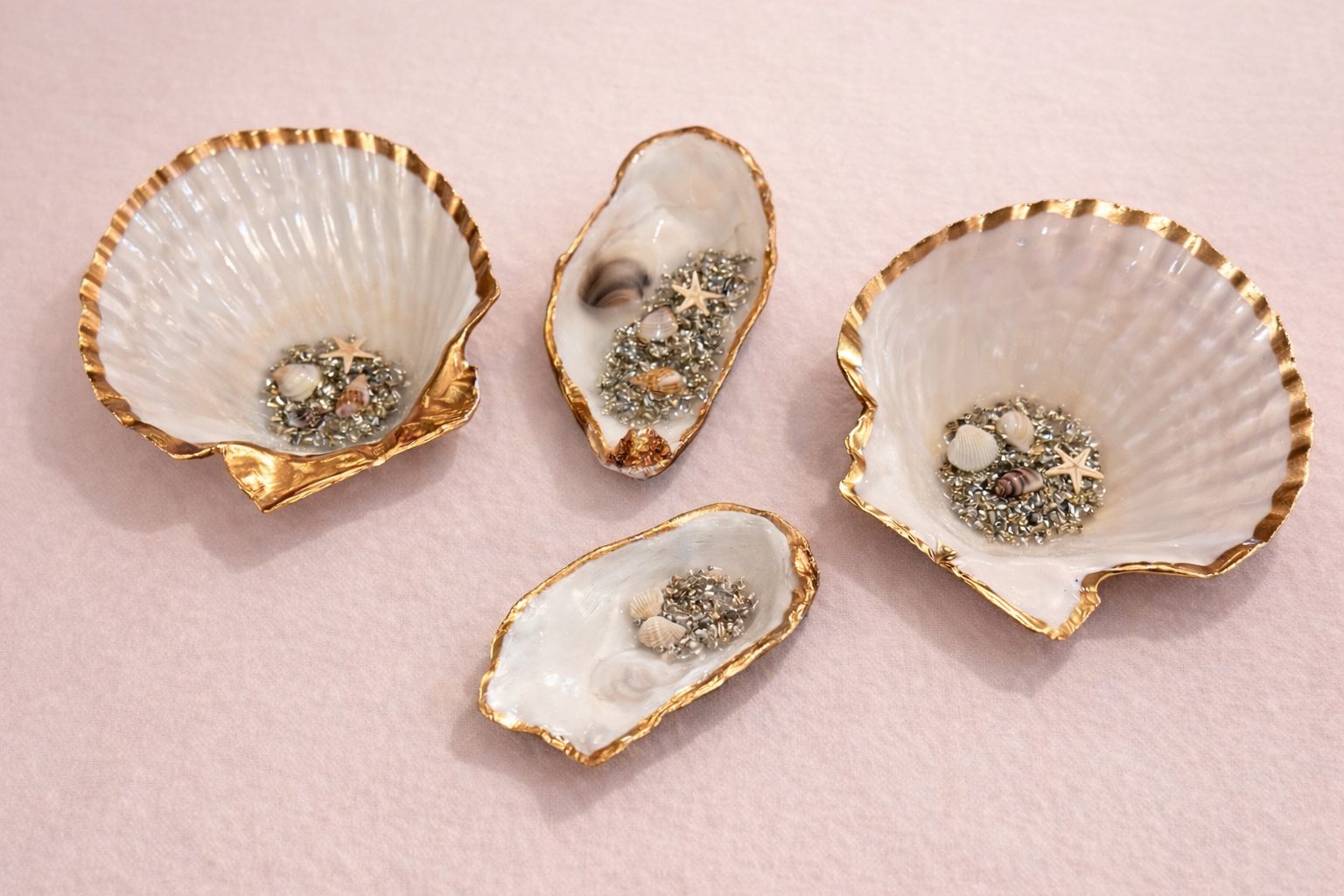 Genuine oyster and scallops shells with a hand-painted gold metallic edge. Filled with shimmering crystal detail and tiny natural shells and starfish for the sweetest seaside sparkle. Each shell is naturally unique, no two are ever the same.