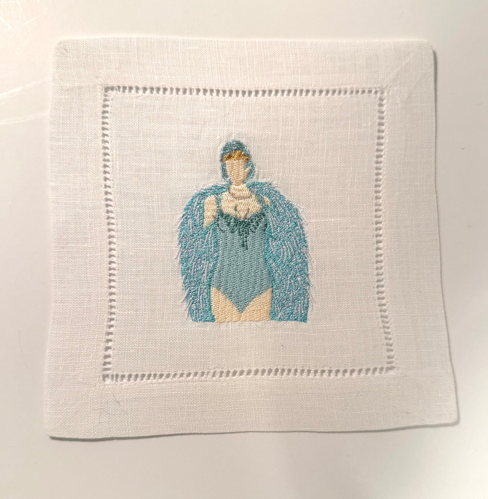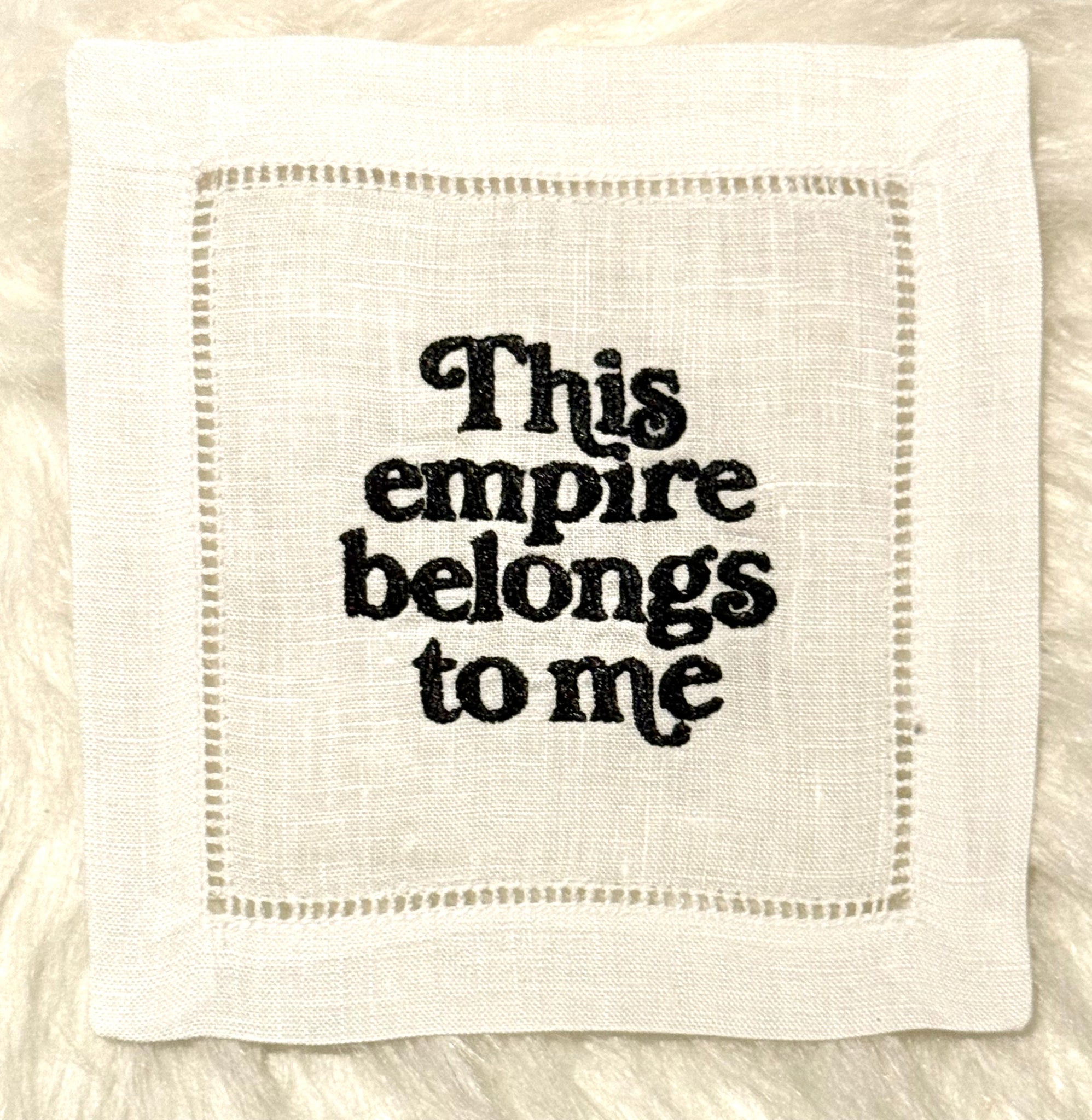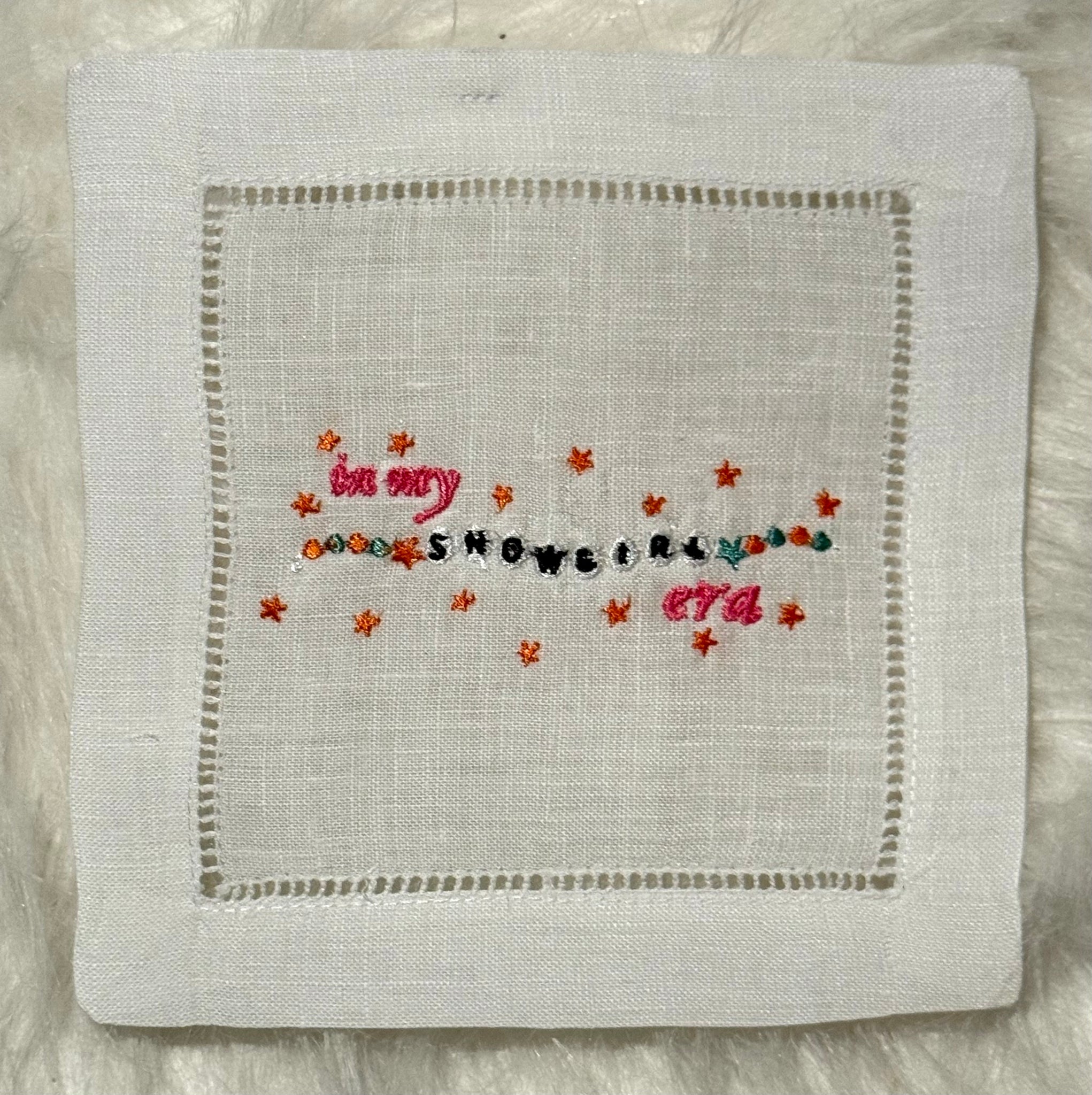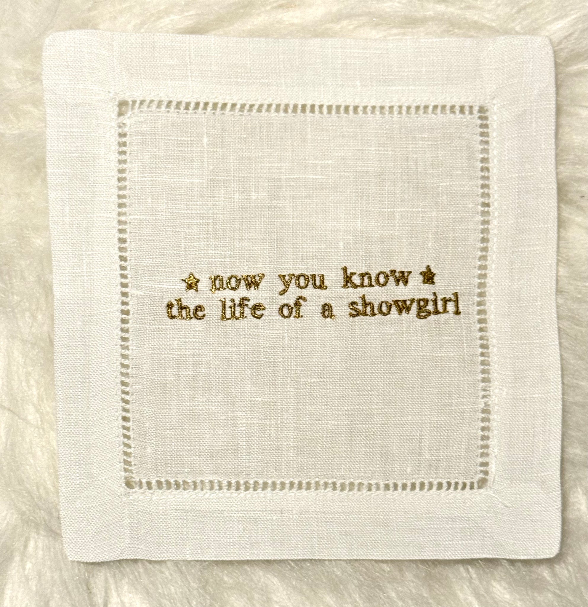 Our version of The Life of a Showgirl translated into our embroidered cocktail napkins. We are excited to interpret all the feathers and glitter coming out of this album!