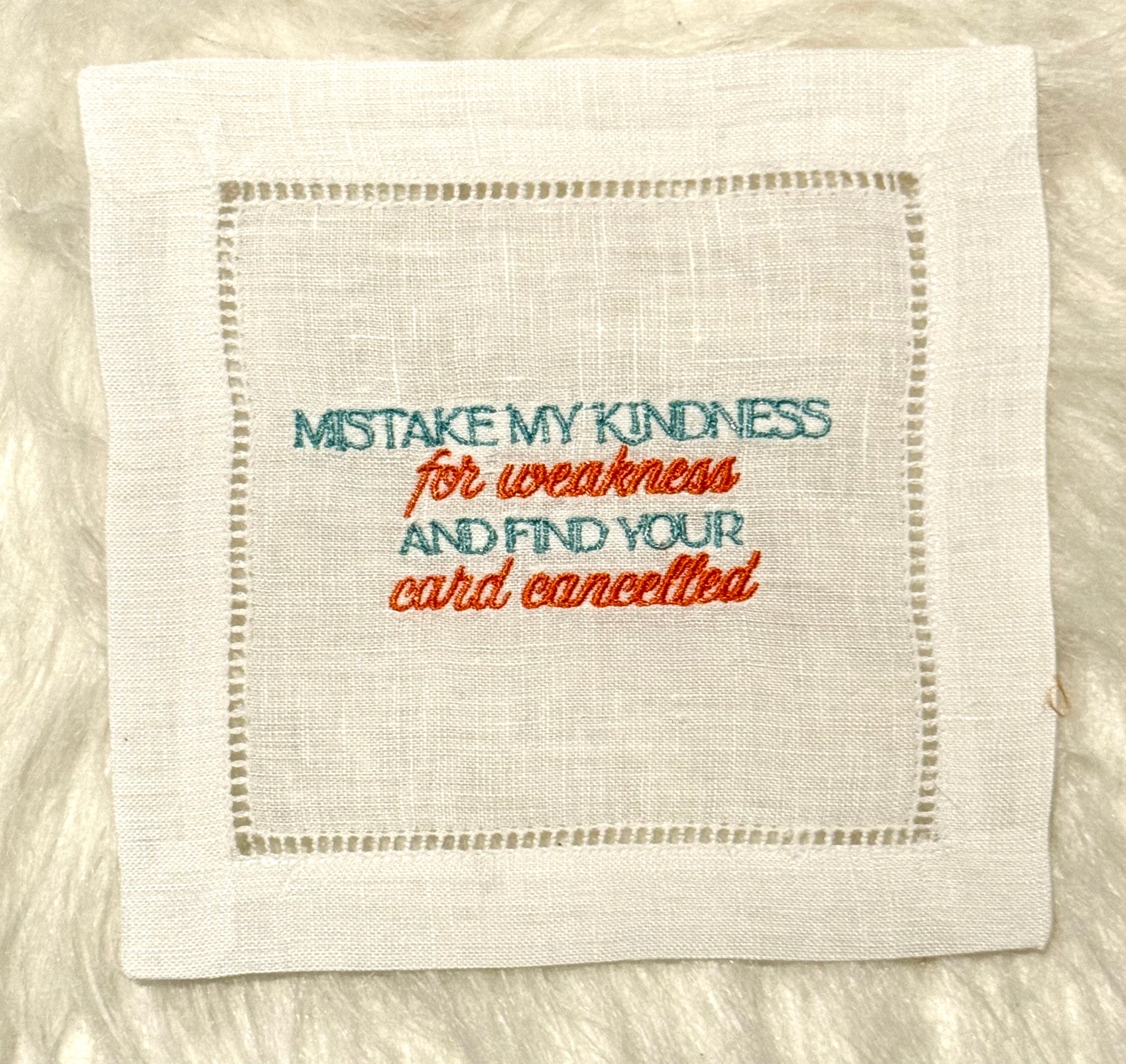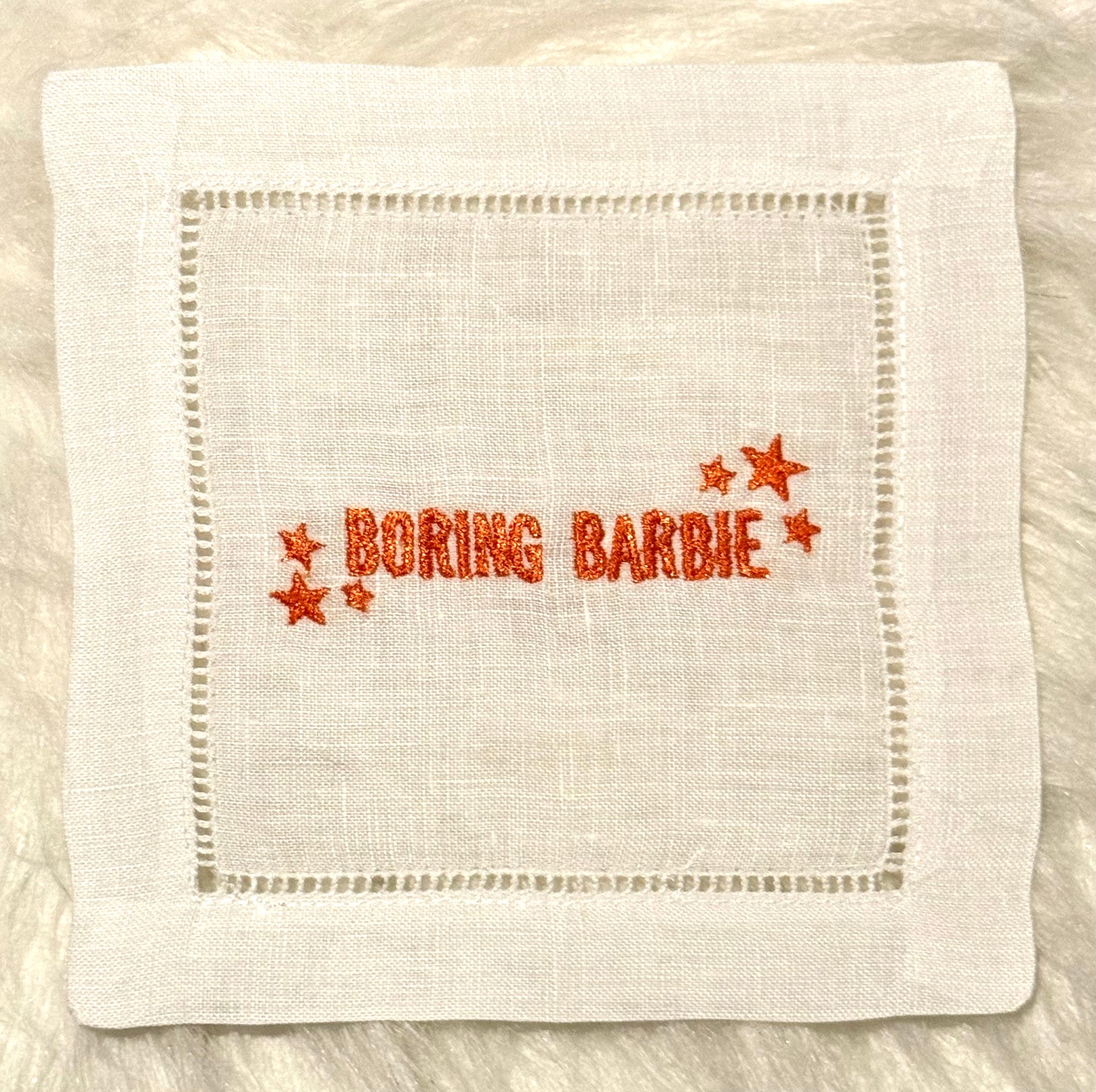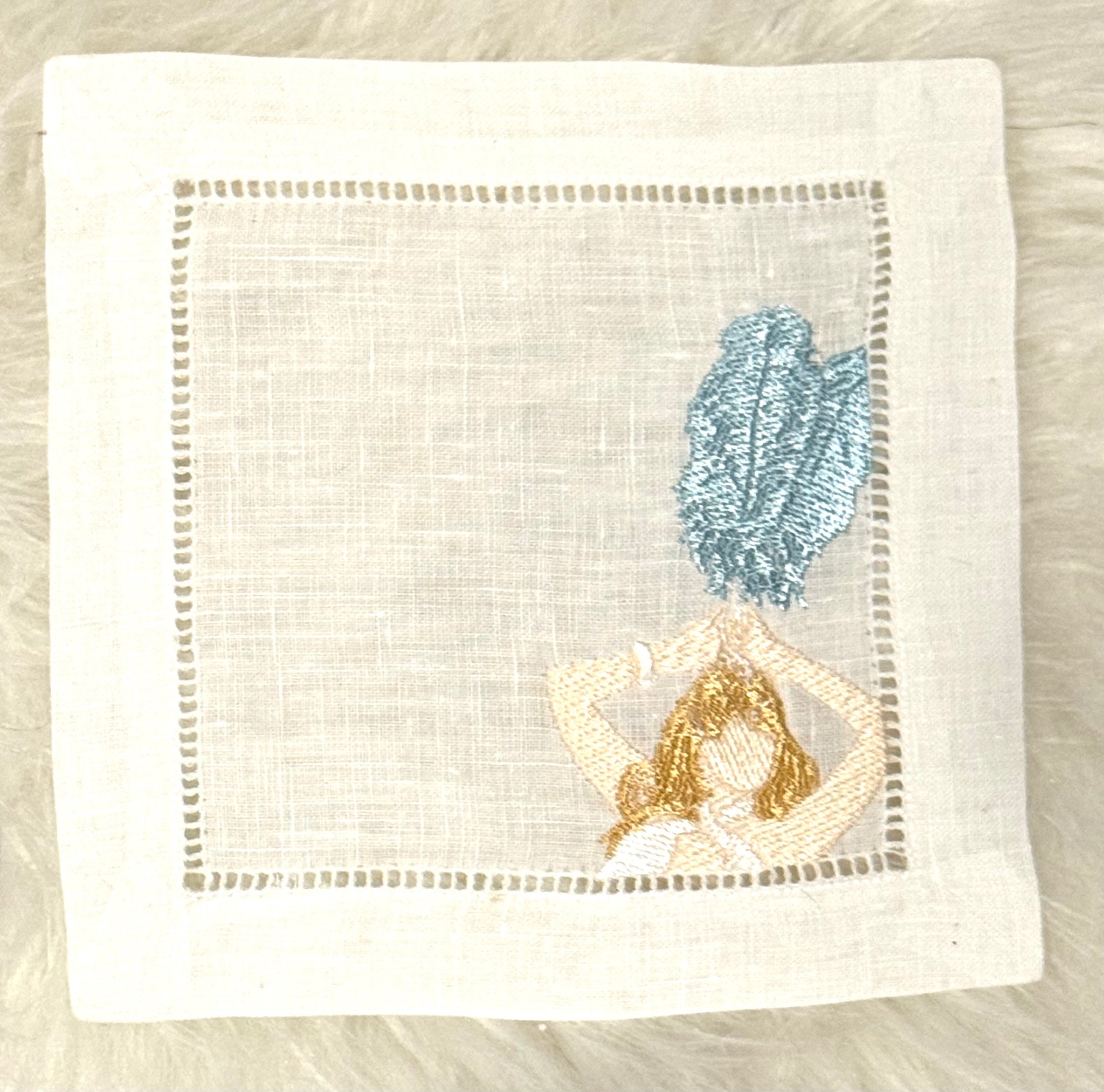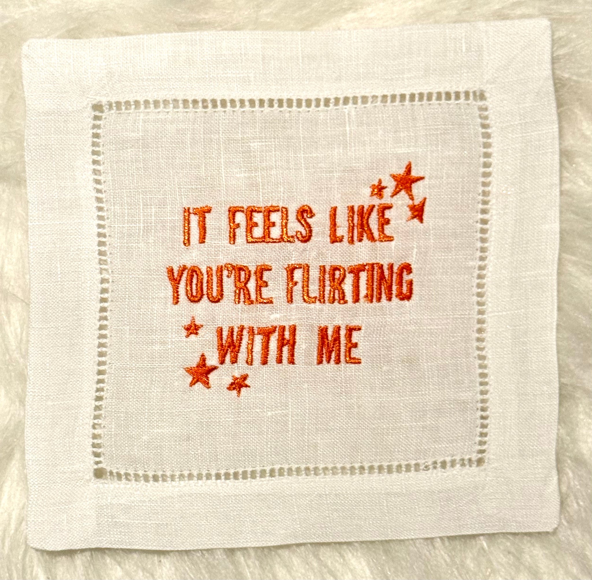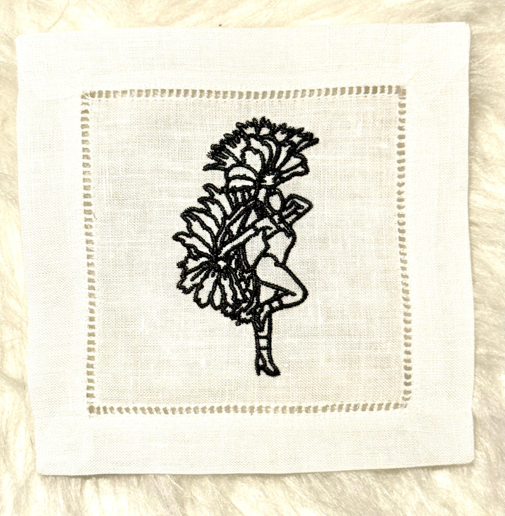 Our version of The Life of a Showgirl translated into our embroidered cocktail napkins. We are excited to interpret all the feathers and glitter coming out of this album!